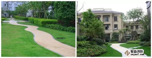 4 中心軟化:在消防車道的中心軸線種植低矮植物或草皮,既不會影響消防車輪的行駛,又美化、軟化了消防車道。可選擇種植小型花灌木等矮地被植物,這類灌木長不高,且常年開花,關(guān)鍵是其不會影響消防車的通行。
